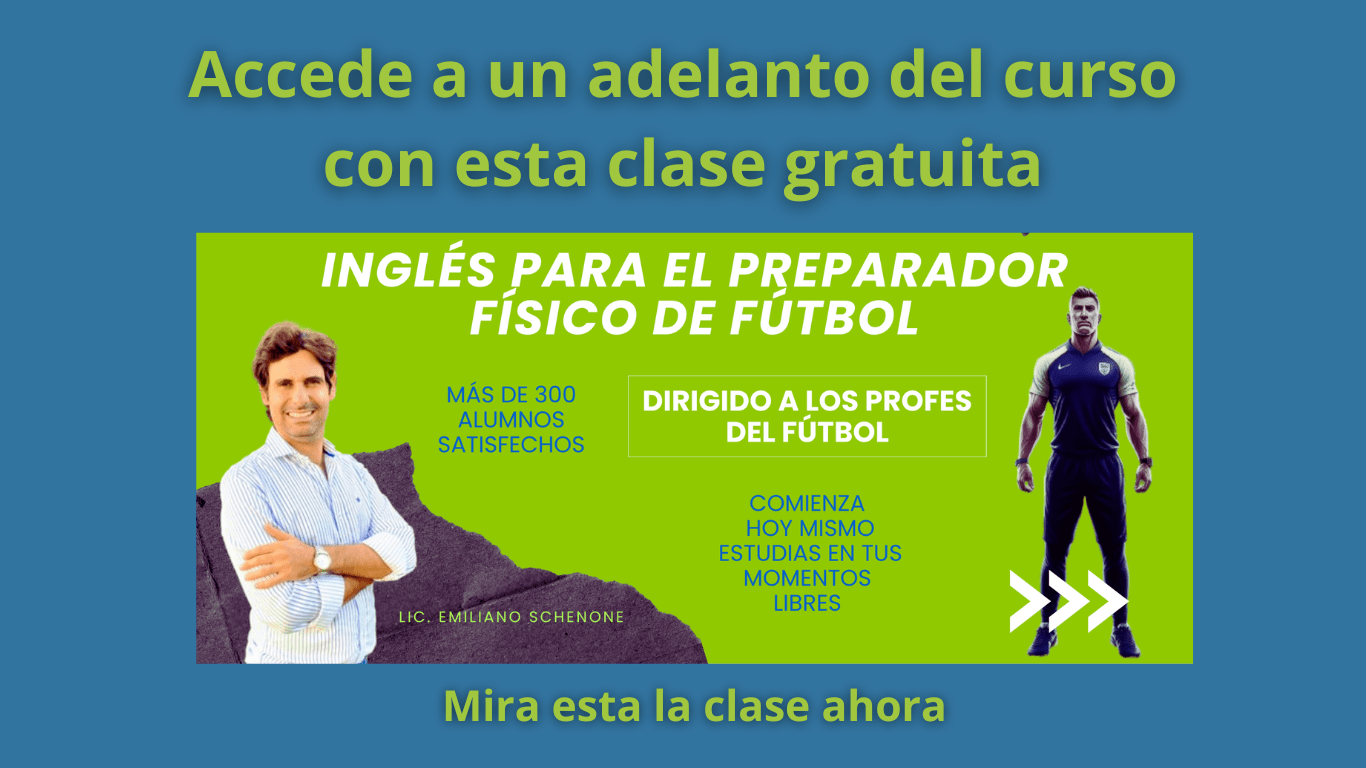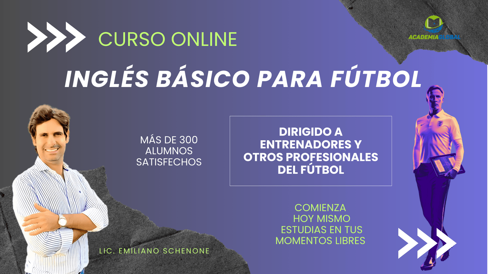 VIDEO PRESENTACIÓNhttps://youtu.be/WP_6n2H9a0Q.Habla inglés como un profesional del fútbol y abre oportunidades en ligas y clubes globales. UN CURSO DIRIGIDO ESPECIALMENTE A ENTRENADORES DE FÚTBOL.TAMBIÉN ES ADECUADO PARA PREPARADORES FÍSICOS, JUGADORES/AS, PERIODISTAS.